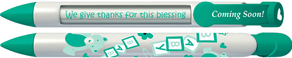 "Coming Soon" Baby Pens® provide a useful and unique way to celebrate pregnancy! They create special, practical keepsakes of this beautiful moment - perfect for Baby Shower gifts and party favors! Pen features 4 messages that rotate with every click of the pen: