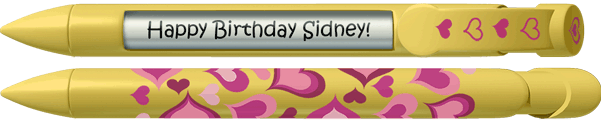 Personalize this pen with 4 rotating messages you write to create a unique and practical keepsake. Great for party favors! Please view the actual rotating pen image above. (Pen is 1mm ballpoint, retractable pen with black ink.)